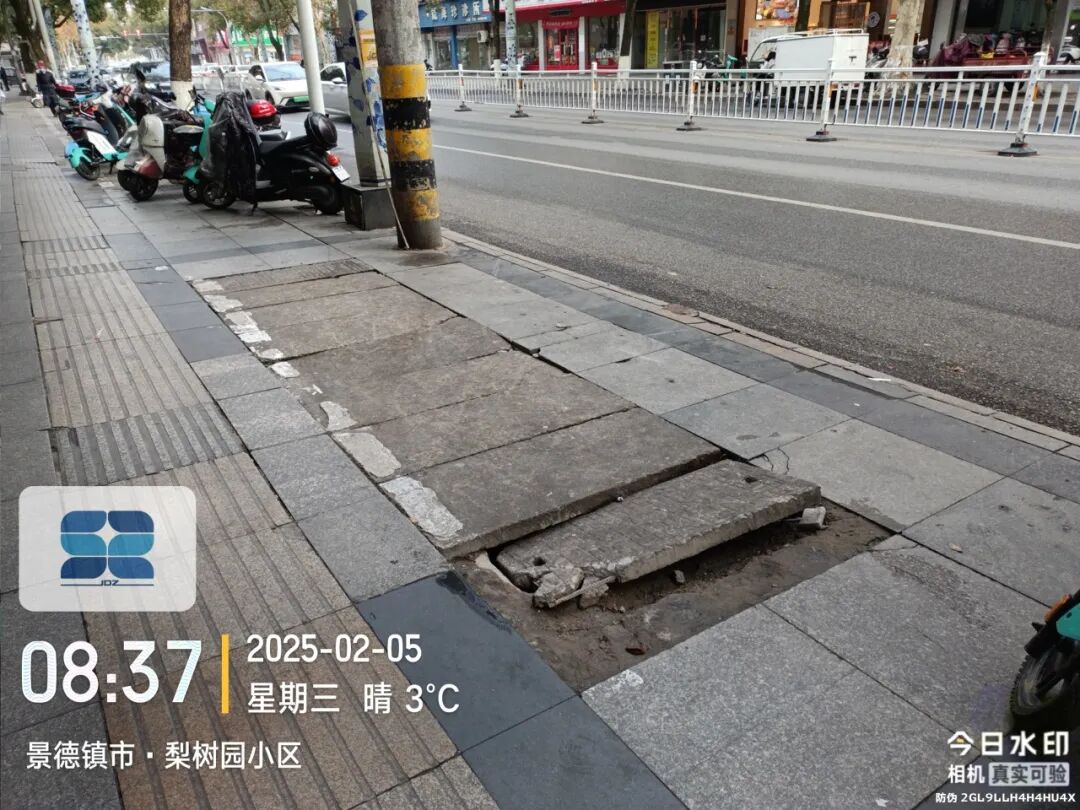 问:广场北路梨树园小区段一供电盖板破损下沉,给市民日常出行带来安全隐患,希望市政部门能尽快处理。