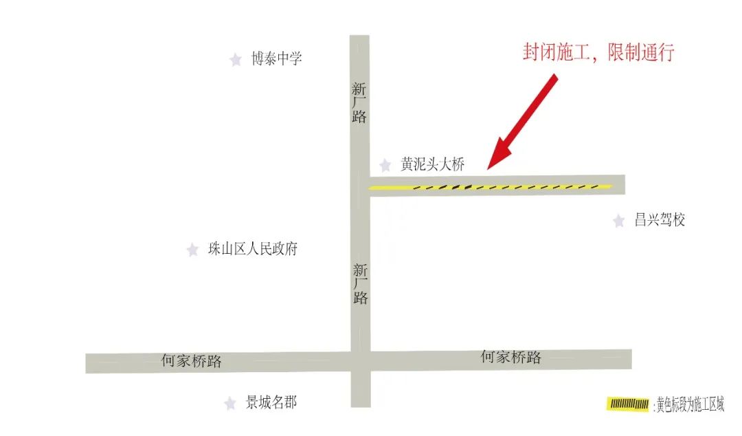 道路状况:102县道黄泥头大桥至昌兴驾校路段封闭施工且限制通行;经过施工区域,请注意安全