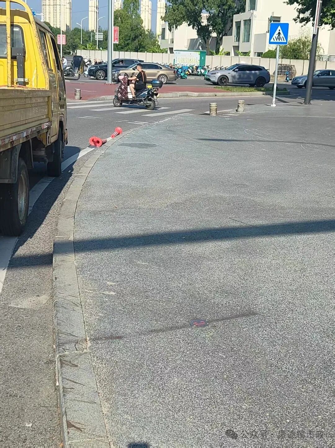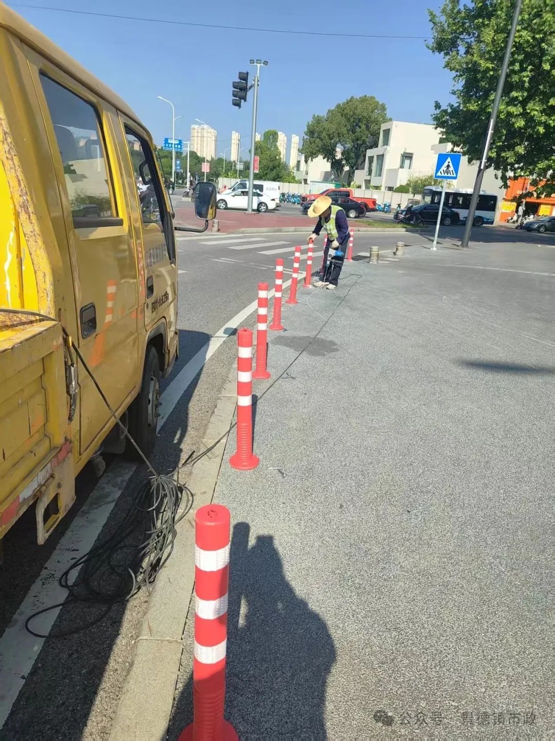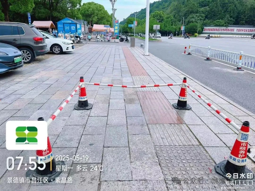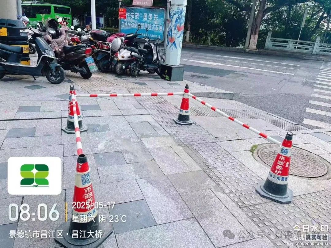 5月16日,养护一线巡查发现,景德东大道与陶阳南路交叉口,由第十七中学往九集小镇右行方向人行坡道不明显,影响市民日常出行安全。市政及时增设塑料交通障碍柱予以警示,现已处理完毕,效果如下图所示。