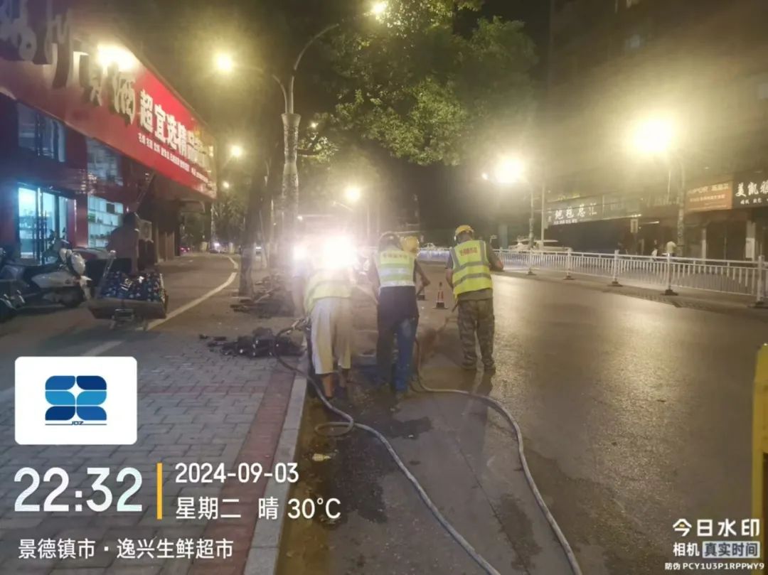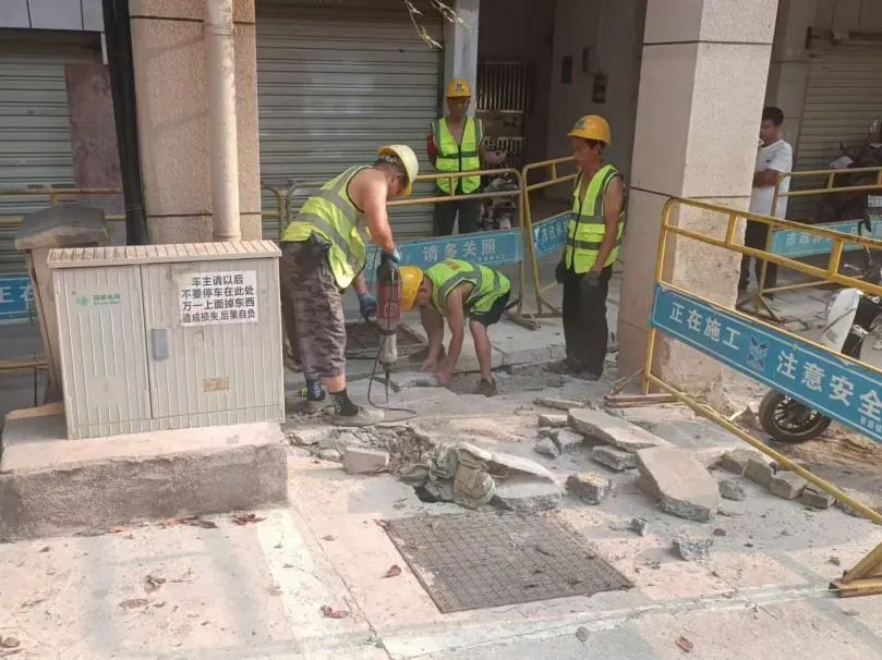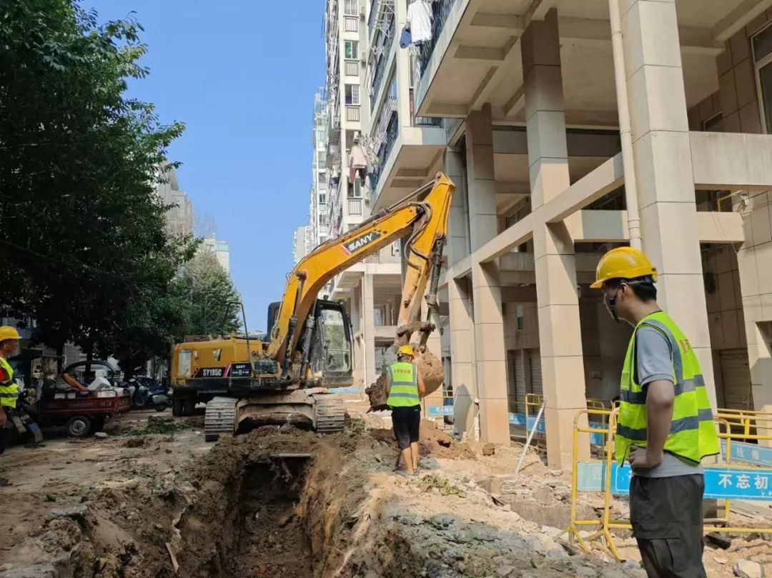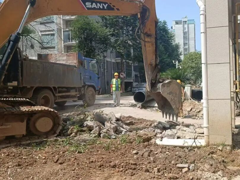 施工动态:目前正在进行路面炮头破碎、沟槽开挖及埋管、检查井砌筑、洒水除尘等施工