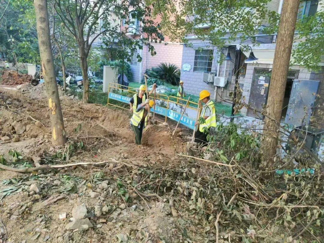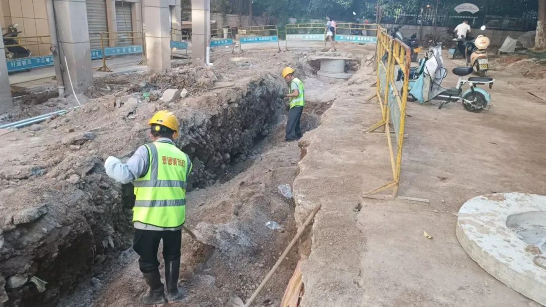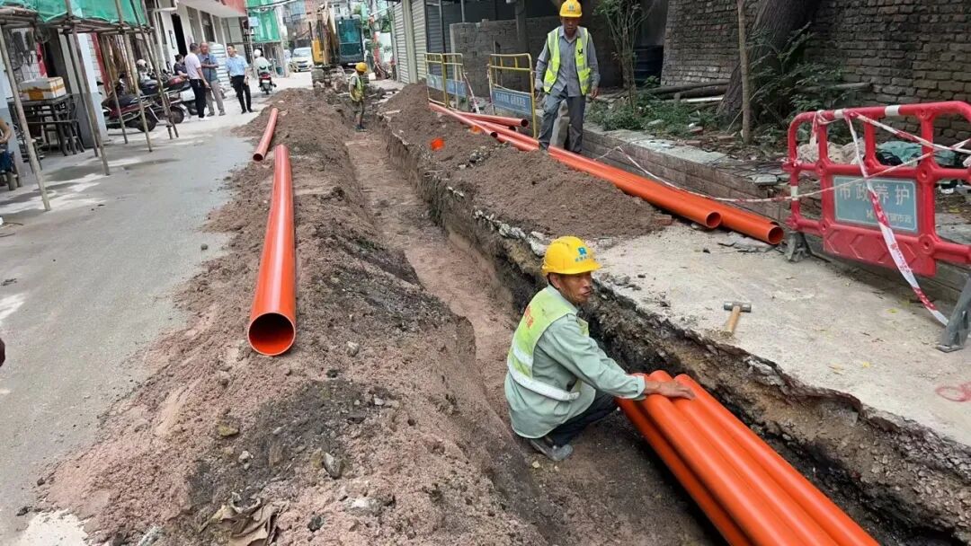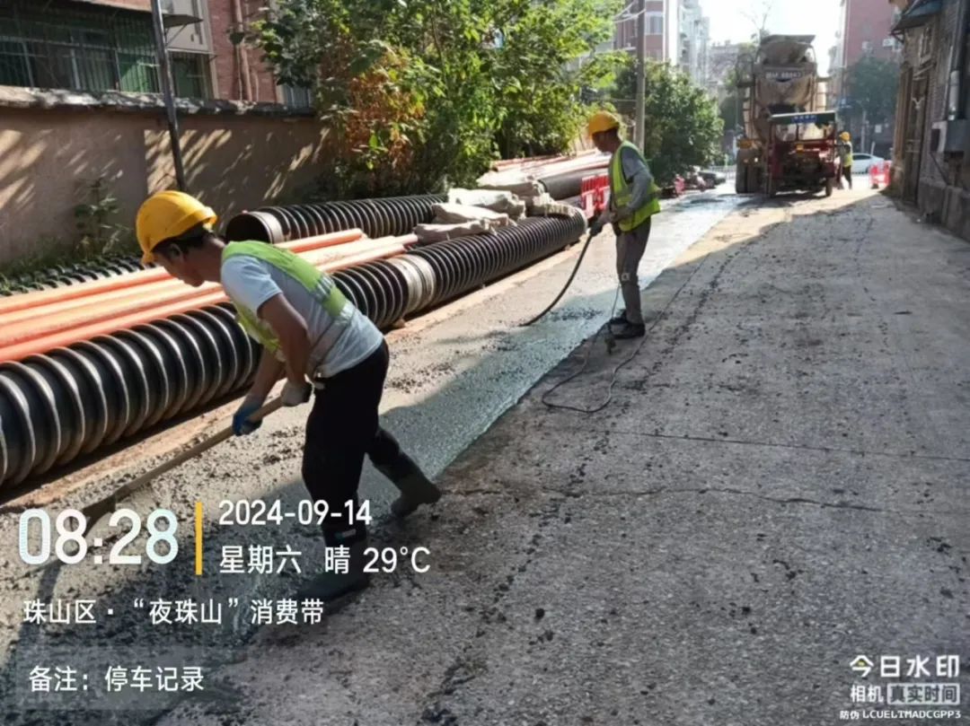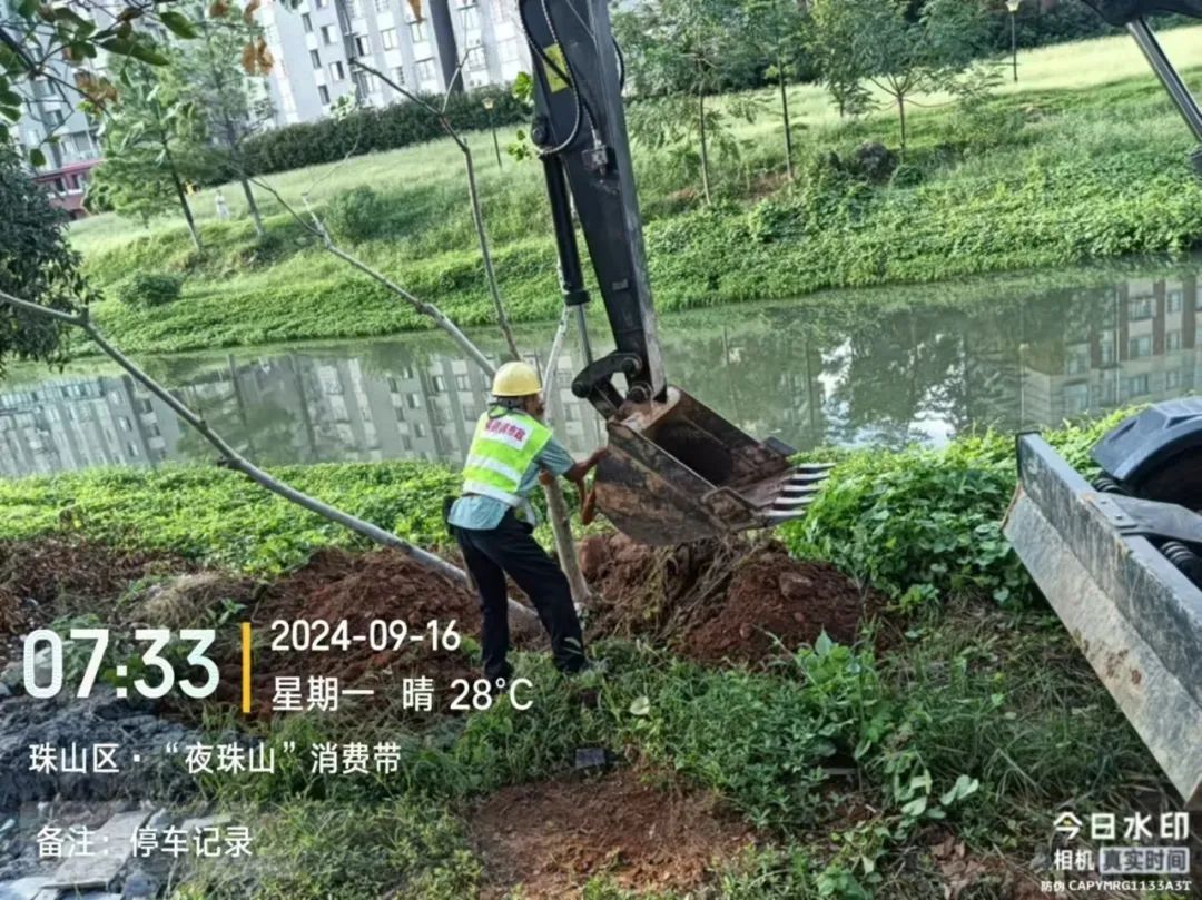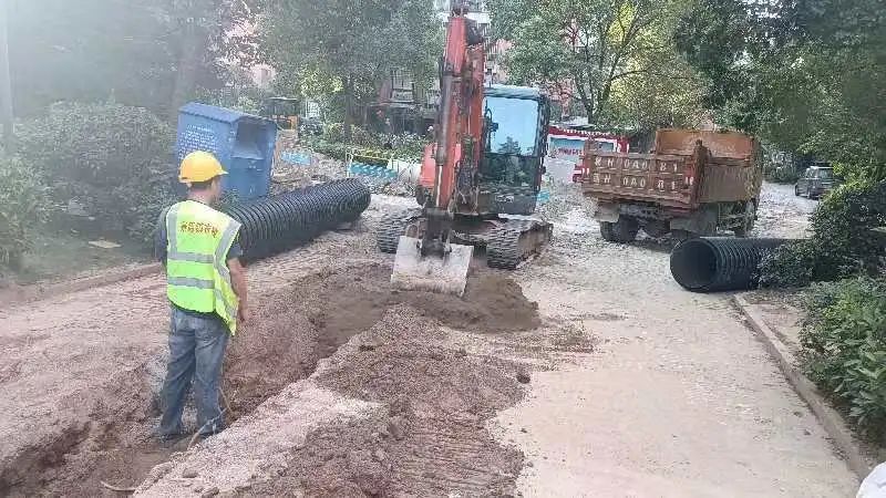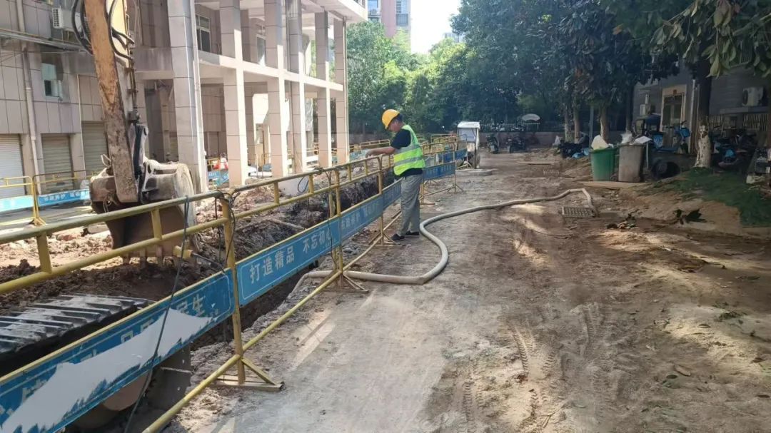施工动态:目前南湖丽景小区、圣罗帝景小区、蝶恋园小区正在进行沟槽开挖及埋管、检查井砌筑、洒水除尘等施工;童街段正在进行南河边树木移栽及修整、路面整平、停车场整治等施工