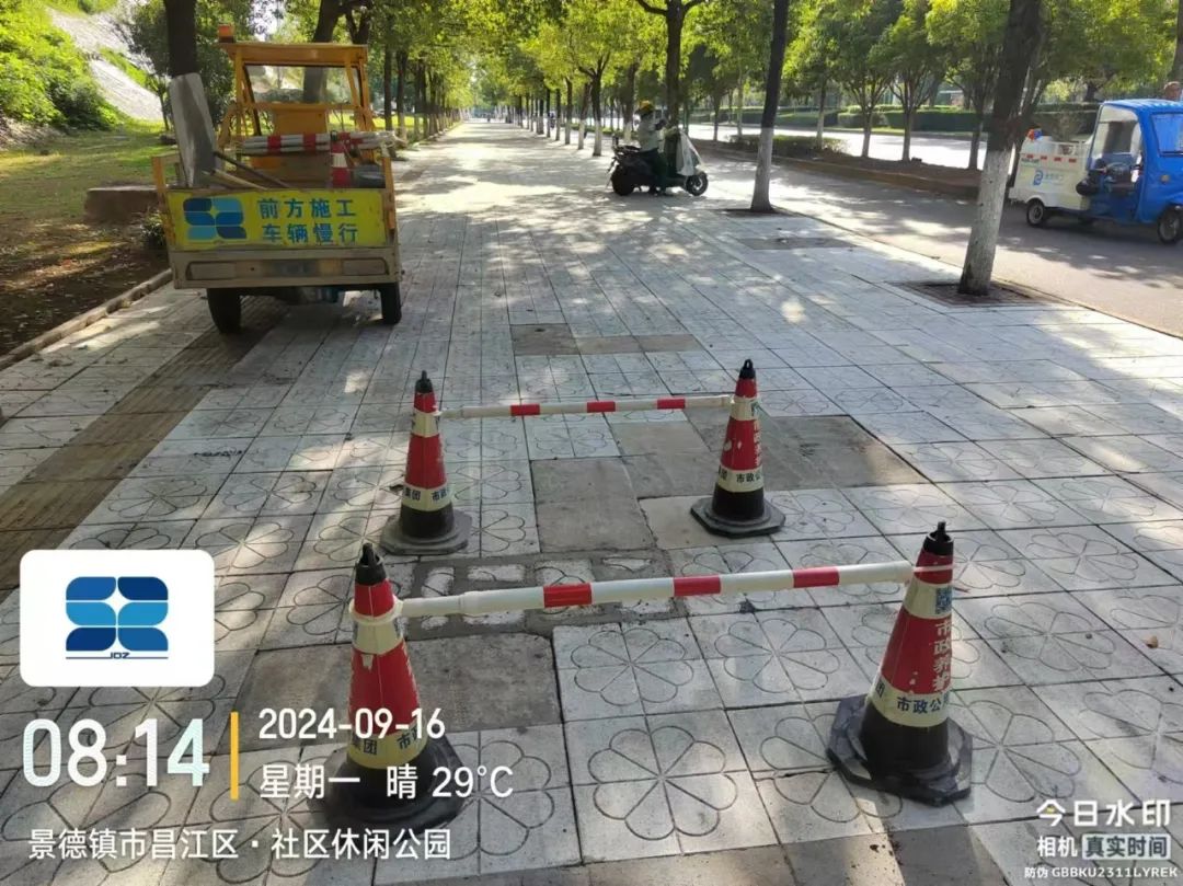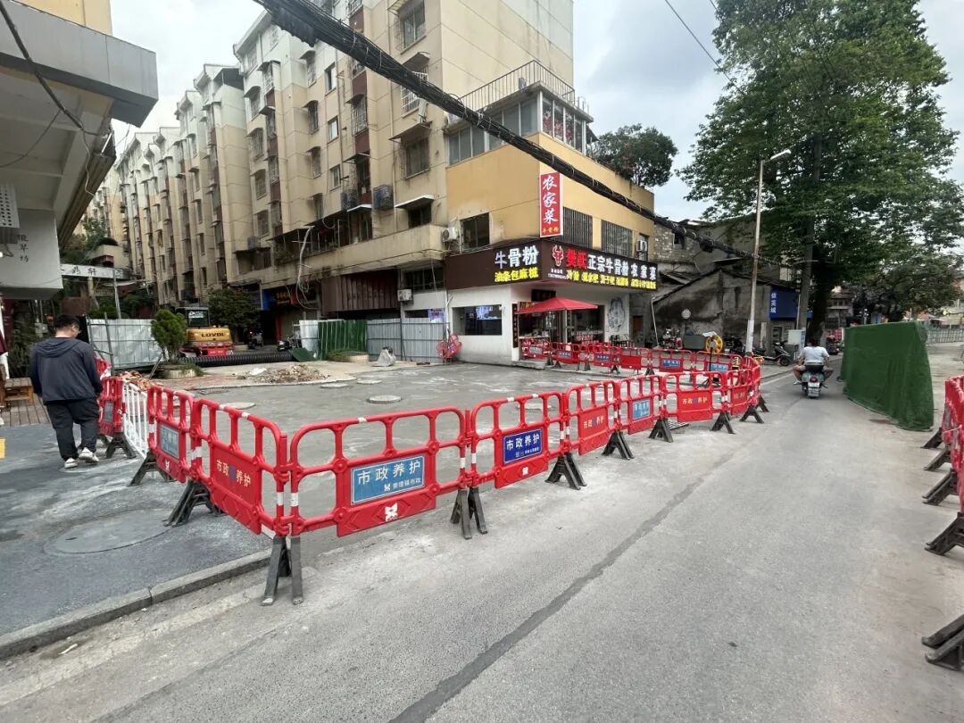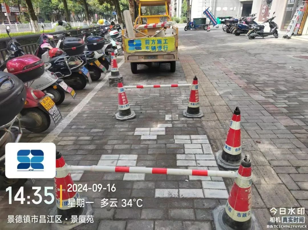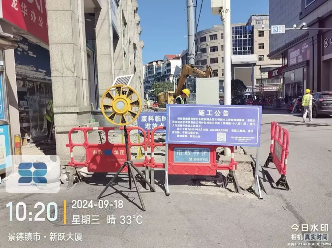 道路状况:人行道间断性封闭施工,经过施工区域,注意安全