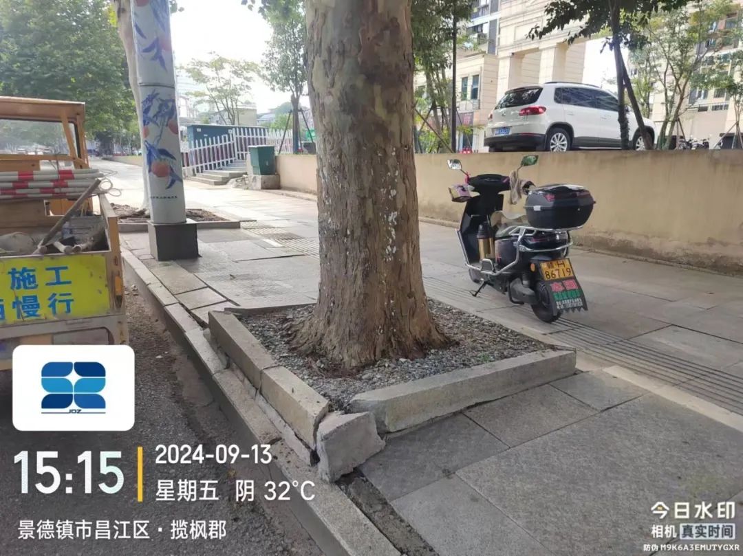 问:新风路揽枫郡段一人行道树围破损,影响道路环境美观。希望有关部门能及时解决。