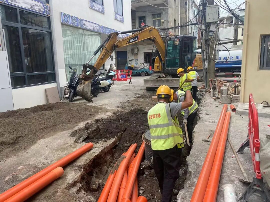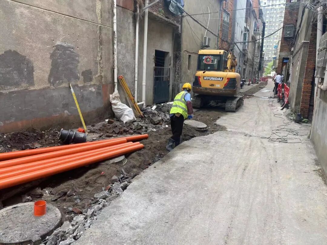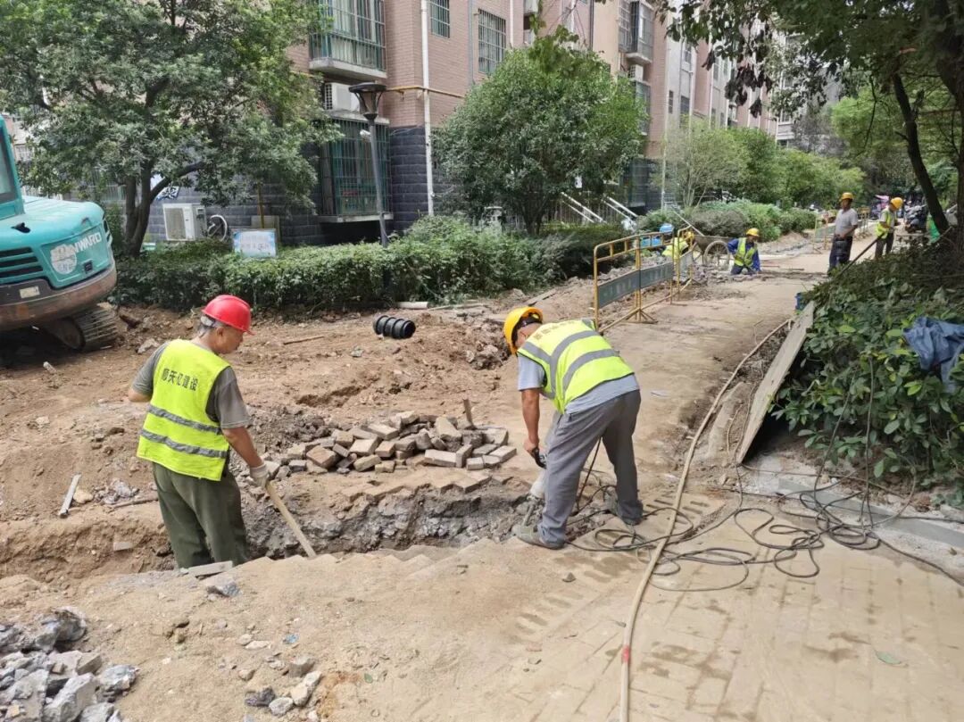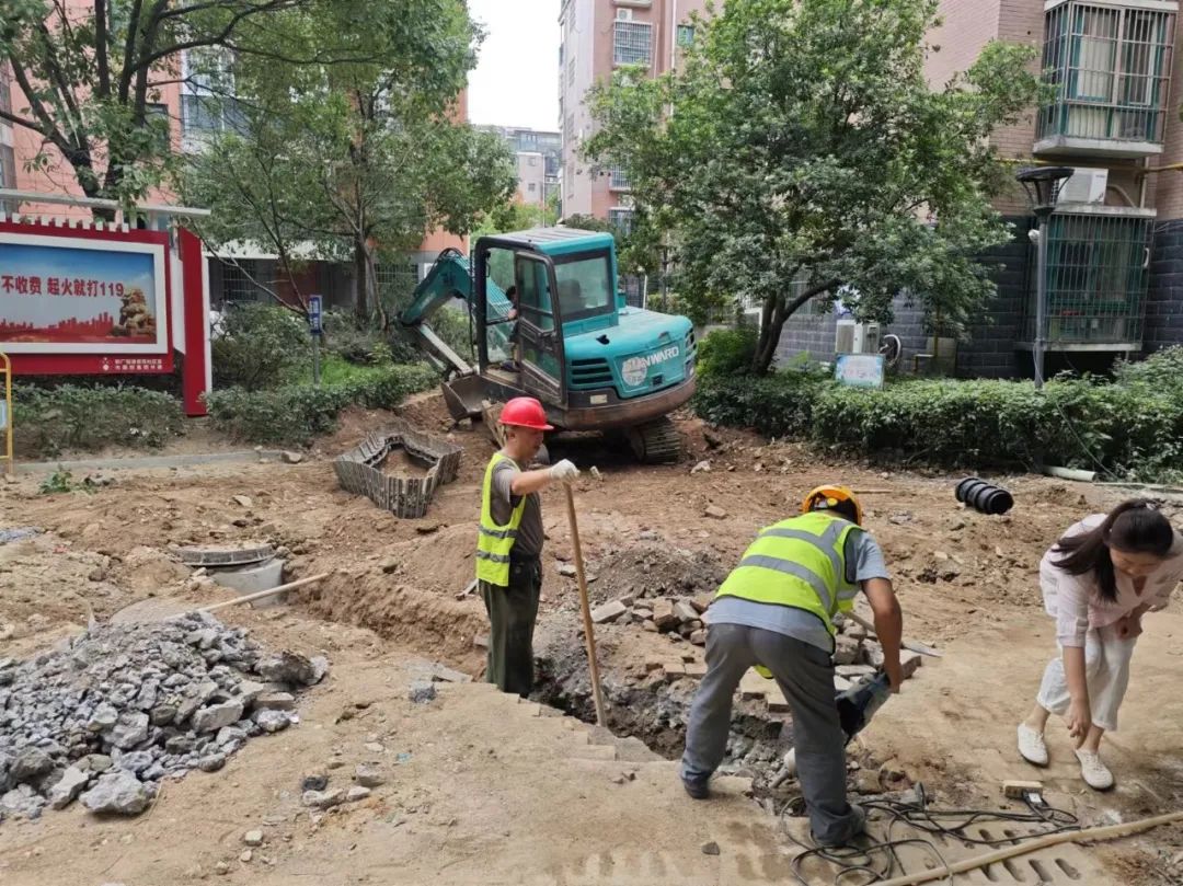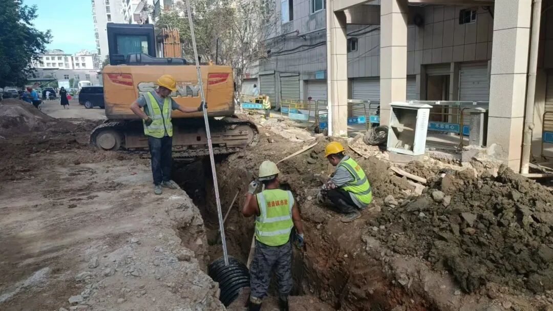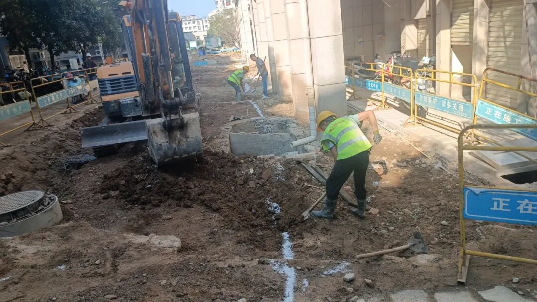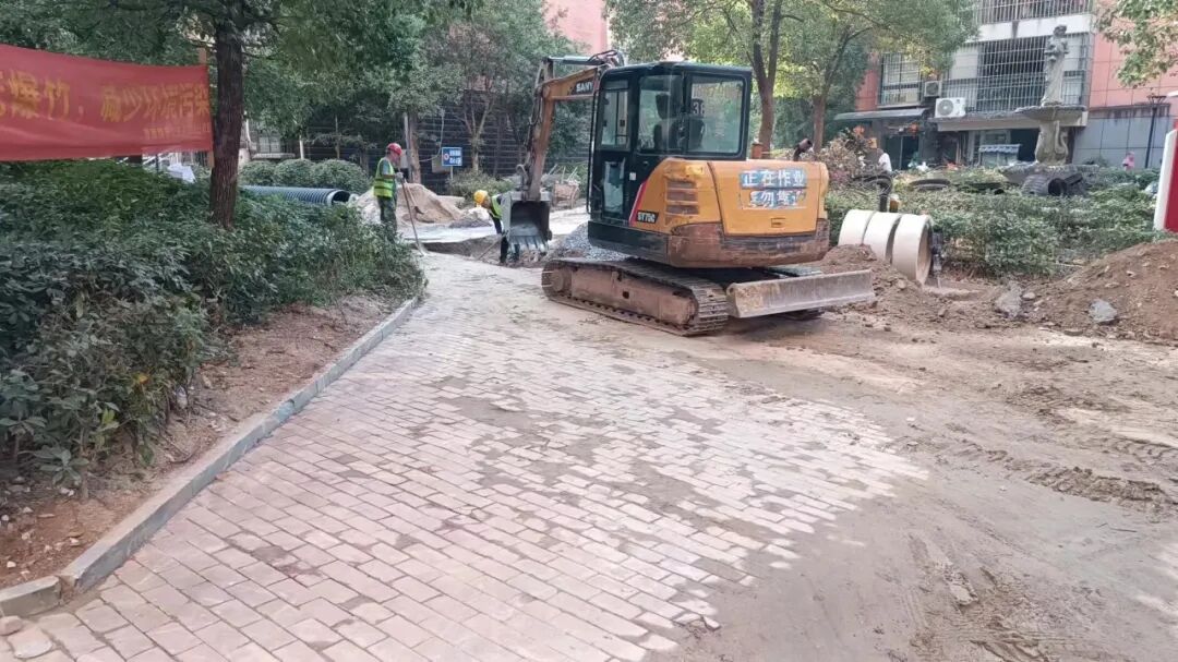 施工动态:目前南湖丽景小区、圣罗帝景小区、蝶恋园小区正在进行沟槽开挖及埋管、检查井砌筑、洒水除尘等施工;童街段正在进行树木移栽及修整、沟槽开挖及埋管、检查井砌筑等施工
