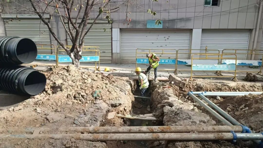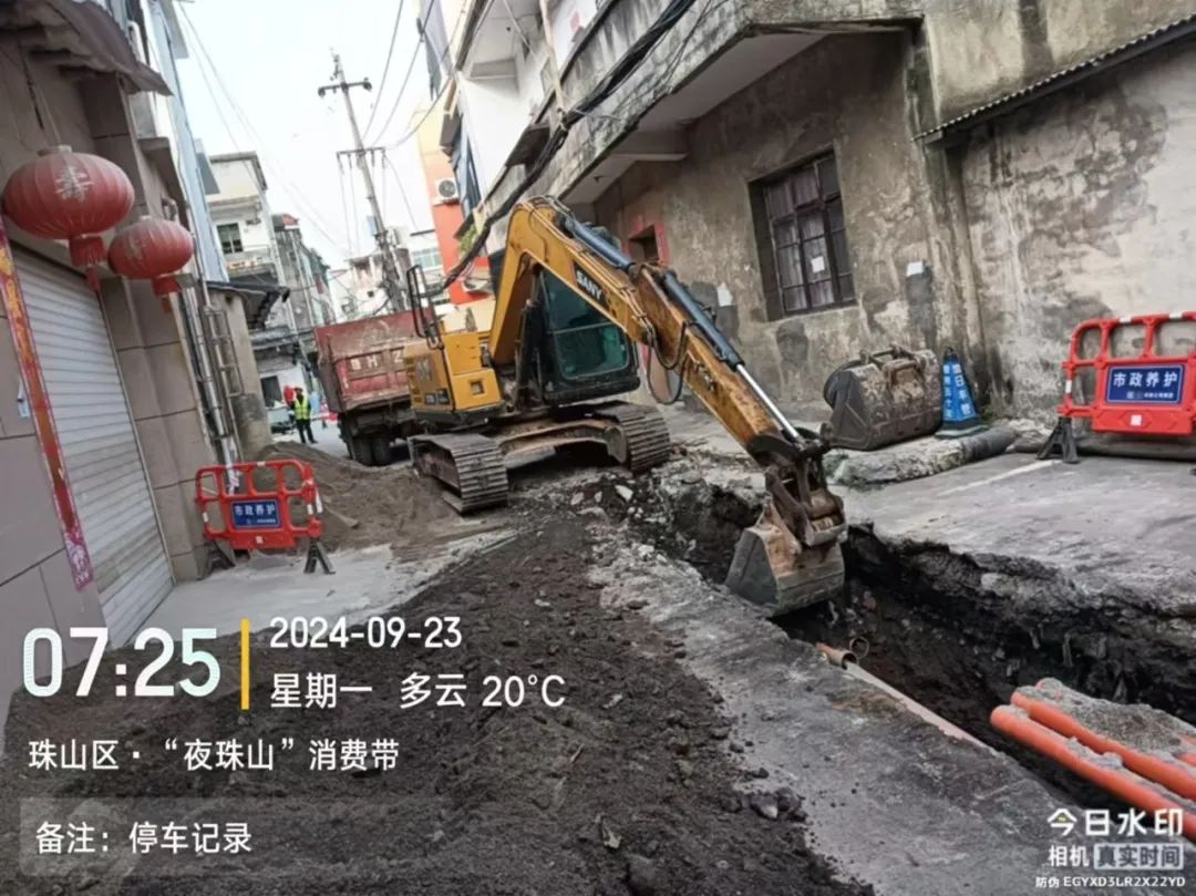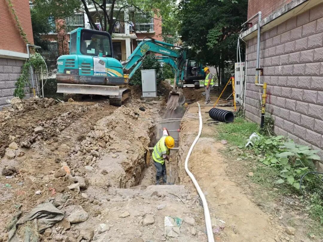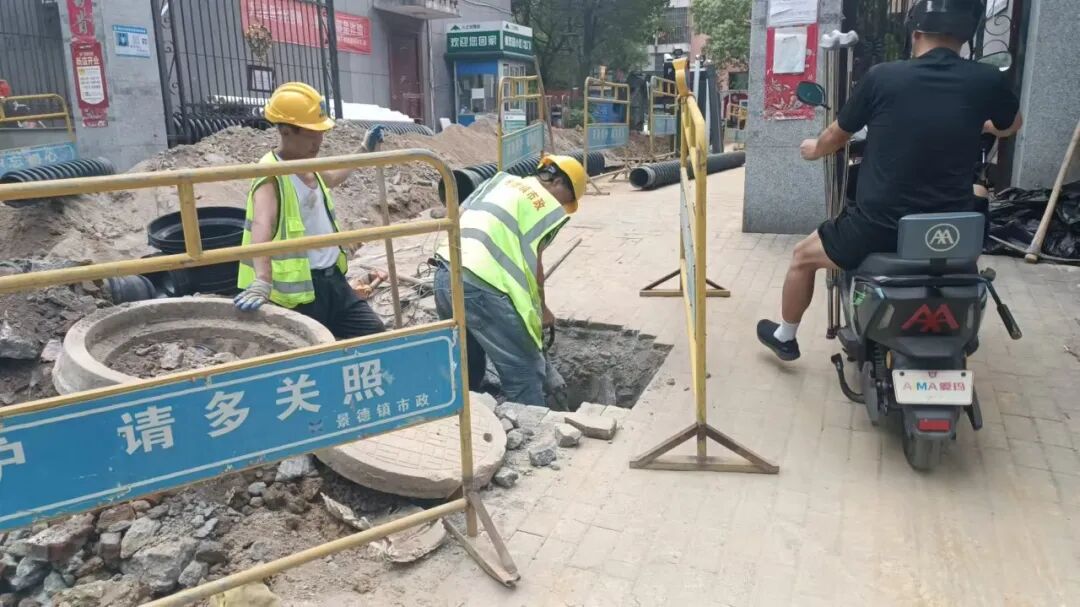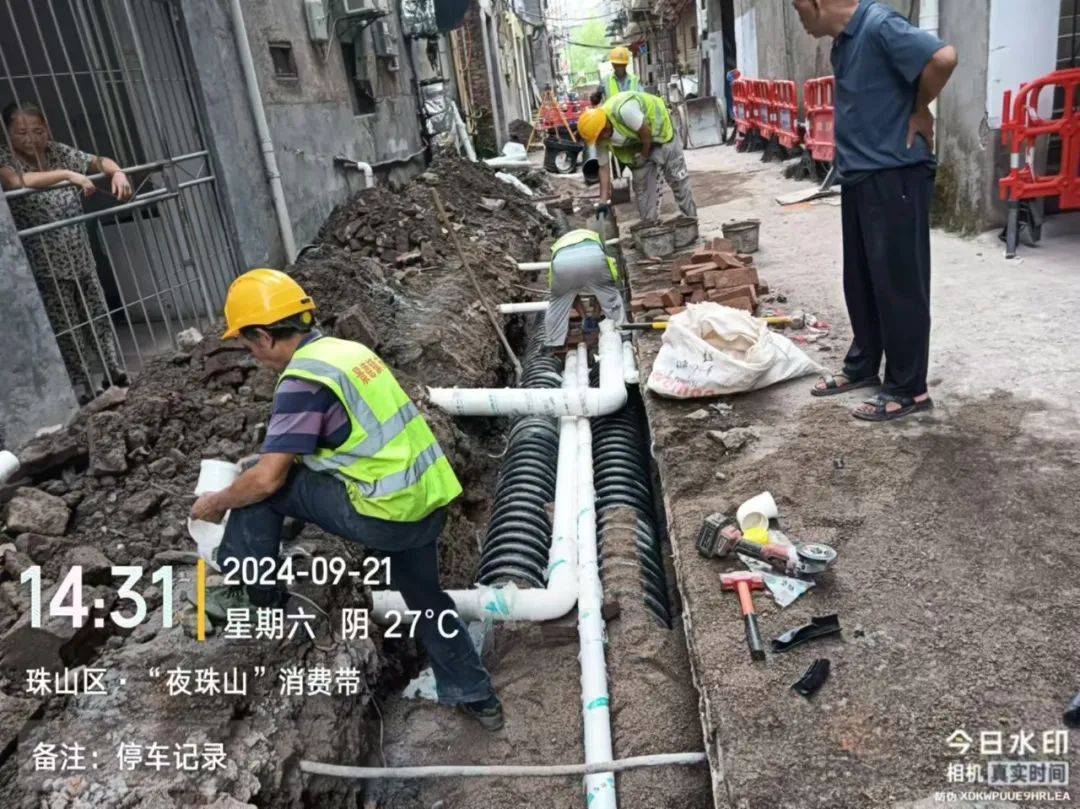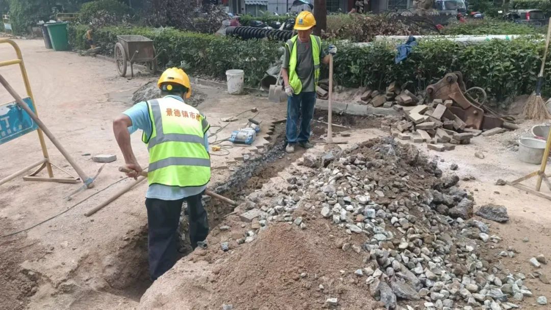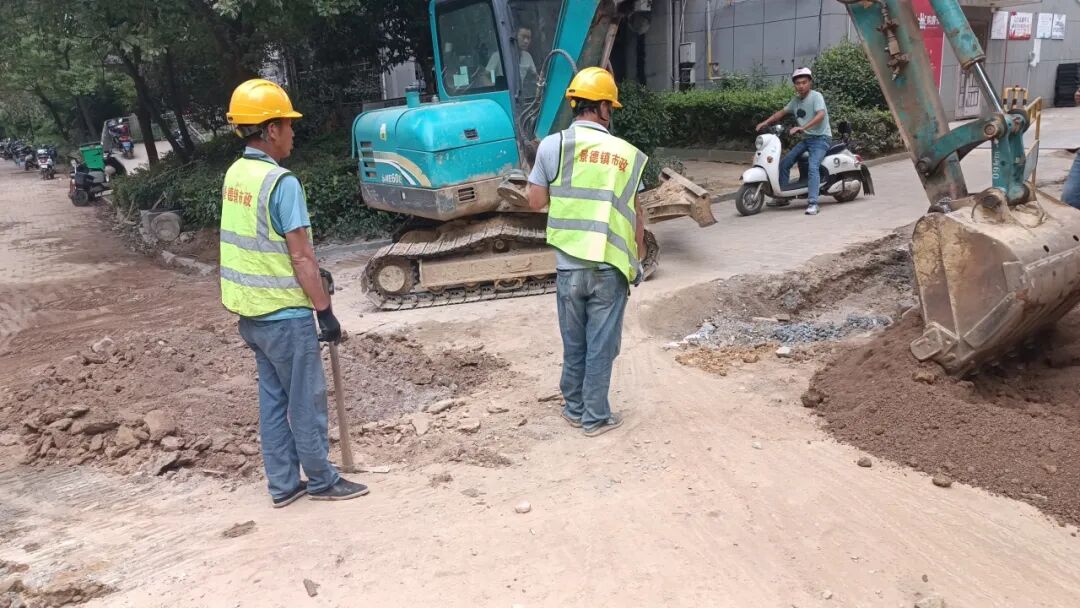 施工动态:目前南湖丽景小区、圣罗帝景小区、蝶恋园小区正在进行沟槽开挖及埋管、检查井砌筑、洒水除尘等施工;童街段正在进行树木移栽及修整、沟槽开挖及埋管、检查井砌筑等施工