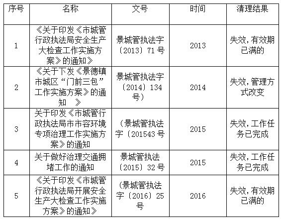 为加强规范性文件的规范管理,推进依法行政,建设法治机关,根据《景德镇市人民政府办公室关于印发景德镇市规范性文件清理工作实施方案的通知》(景府办字〔2017〕81号)要求,我局对2010年8月1日至2016年12月31日之间发布的规范性文件进行了全面清理,形成了《景德镇市城市管理行政执法局规范性文件清理目录》,现将清理结果予以公布: